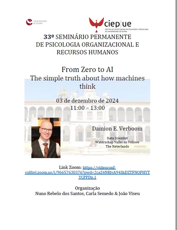 | Citation: | Verboom, D. (dezembro, 2024). From zero to AI: The simple truth about how machines think. 33.º Seminário Permanente de Psicologia Organizacional e Recursos Humanos. Departamento de Psicologia e Centro de Investigação em Educação e Psicologia, Universidade de Évora. |